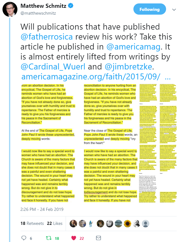 Will publications that have published @fatherrosica review his work? Take this article he published in @americamag. It is almost entirely lifted from writings by @Cardinal_Wuerl & @jimbretzke. ☩ Matthew Schmitz via Twitter